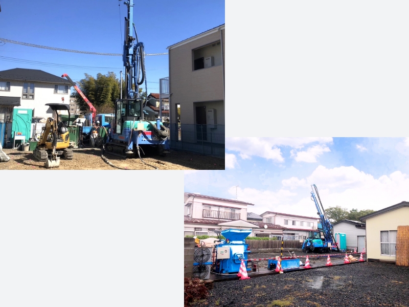 地盤改良部門では軟弱な地盤を強固な地盤へ補強し、不同沈下を防止するために行う工事です。当社では住宅から一般建築物、土木構造物下の地盤改良などを行います。柱状改良、鋼管杭工法、表層改良工法など様々な工法に対応可能ですので、その地盤に適した工法をご提案させていただきます。